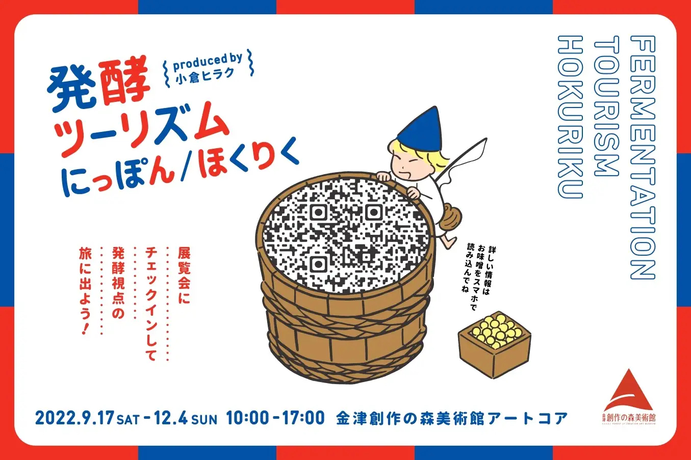 知られざる47都道府県&北陸発酵ローカル文化が金津創作の森に大集合!発酵デザイナーというユニークな肩書をもつ小倉ヒラクが、日本各地を訪ね、出会ったローカル発酵食を紹介する「発酵ツーリズムにっぽん / ほくりく」展が2022年9月17日(土)~12月4日(日)に金津創作の森美術館にて開催します。ひとつの発酵食から見えてくるその土地の文化や風土を紹介しながら、“発酵”視点で日本の価値を再発見する旅に誘います。