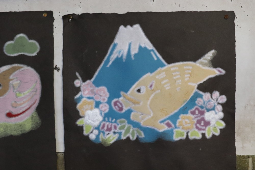 工房には、繊維を金型に引っ掛け、和紙に付着し模様を施す「引っ掛け」という技法で作られたカレンダーが飾られていました。