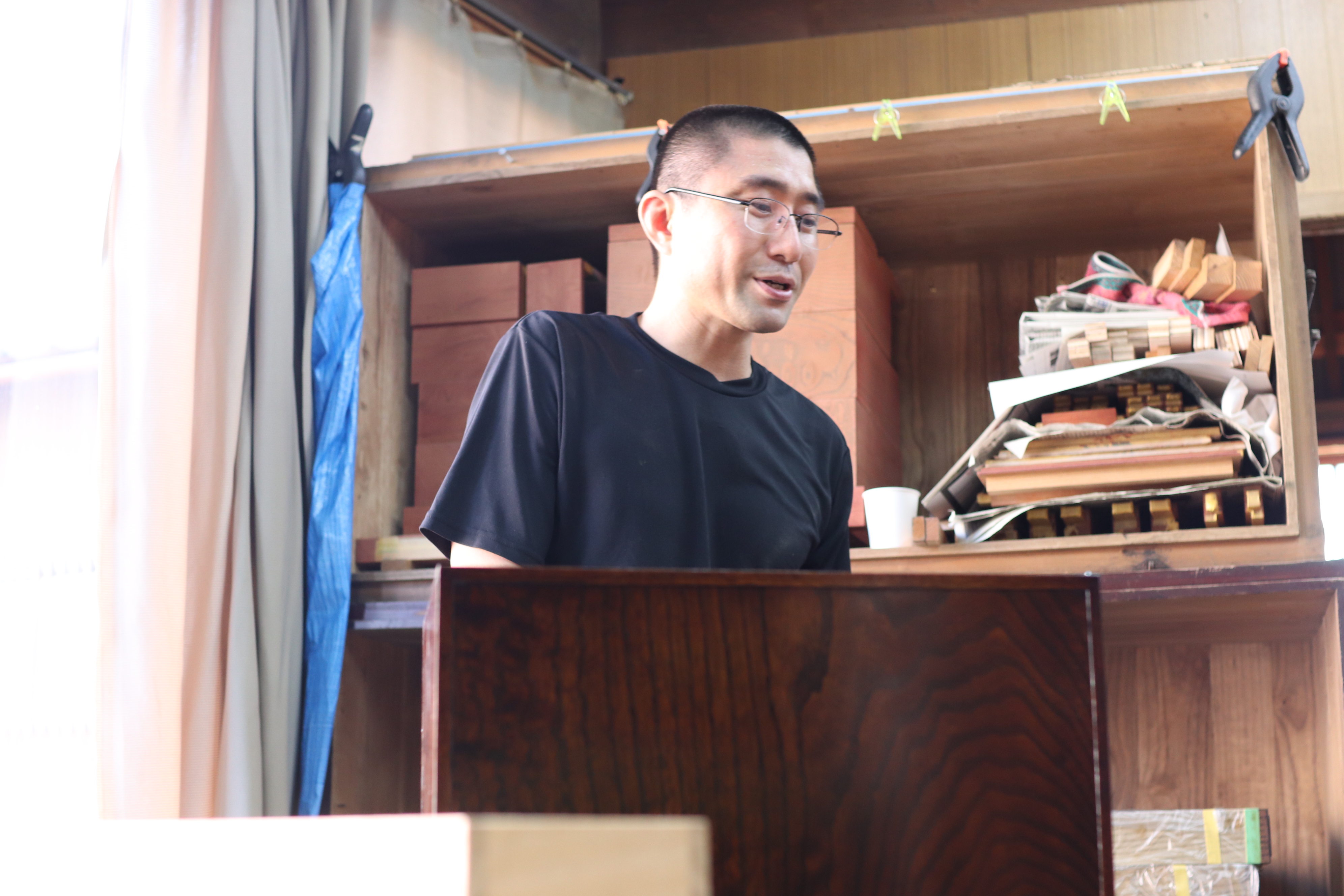 今回工房について丁寧に説明してくださったのは、6年前に親方の上坂さんに弟子入りした長尾さんです。木工に賭ける熱い想いなども伺いつつ、指物について教えてもらうことにしましょう。