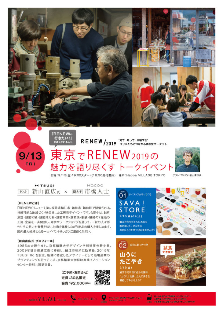 トークではRENEWの取り組みをはじめ、ものづくりやまちのこと、職人への思いを語り合います。実は東京でRENEWのトークイベントが開催されるのは初の試み。また、当日はスペシャルイベントとしてTSUGIが運営するSAVA!STOREのミニPOPUPSHOPと、こちらもRENEWに毎年出店されている「山うに屋 ほやっ停」による鯖江名物「山うにたこ焼き」も出店。東京 新川がリトル鯖江になる1日です。RENEWの予習として、ぜひご参加ください!