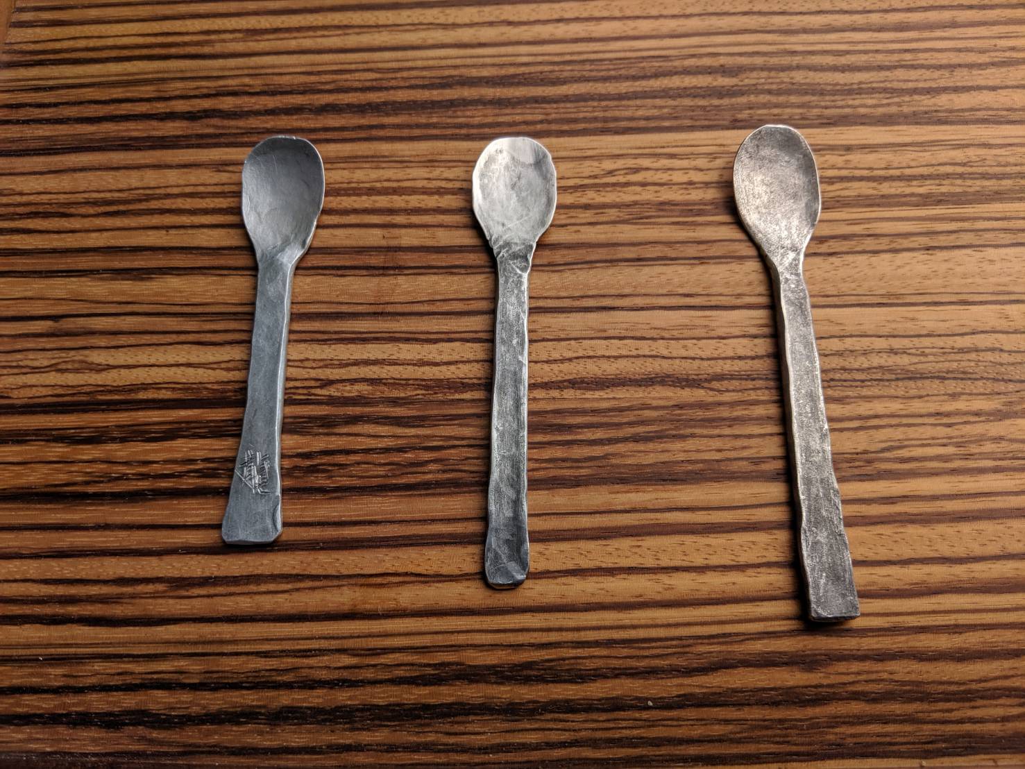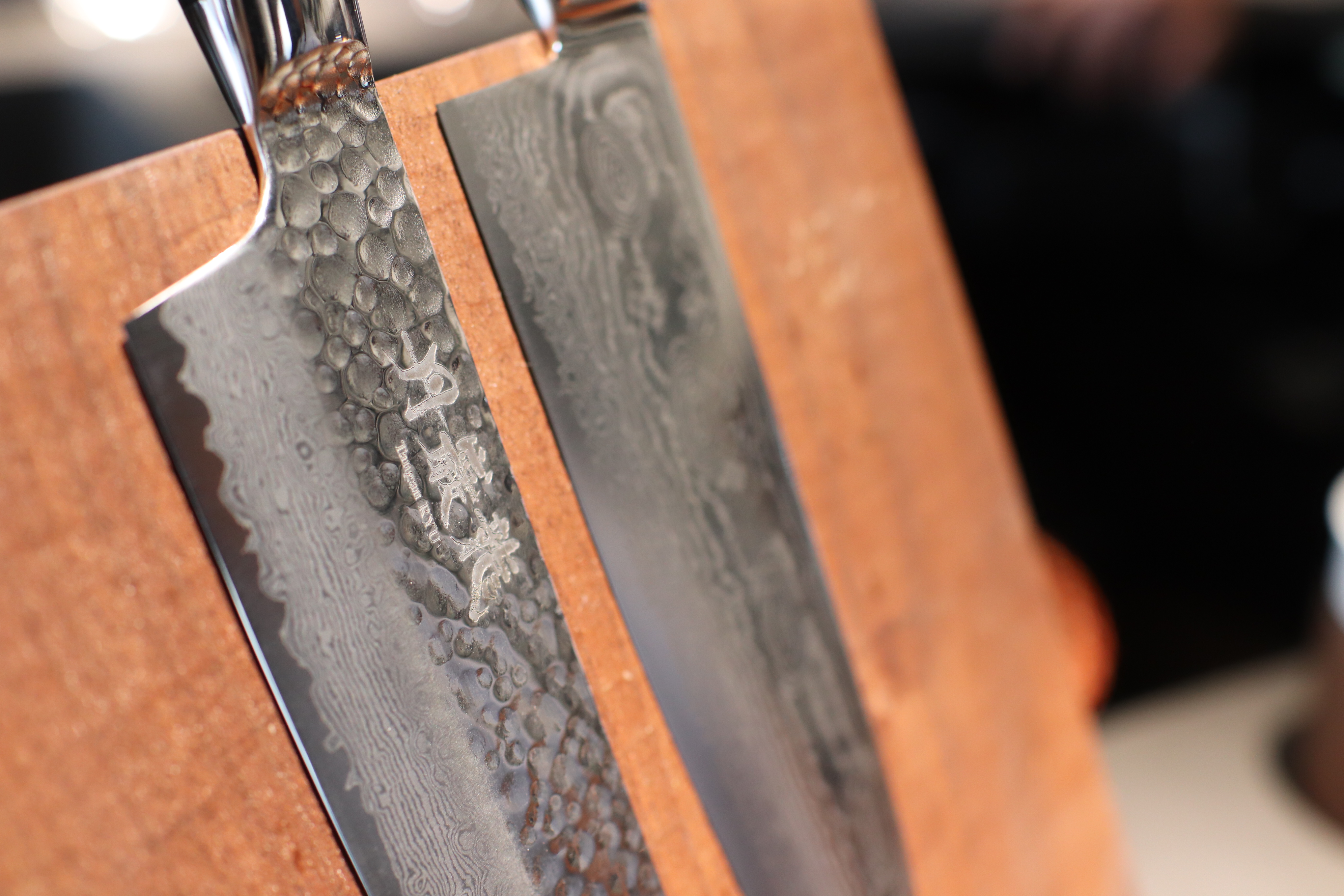 2種類の鋼を交互に重ねて70層にした材料を槌(つち。ハンマー)で打って鍛え、それを平らに磨き上げることで、年輪のような模様が浮かび上がるのです。