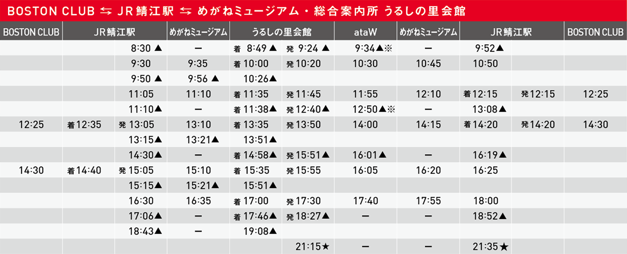 ・▲ 運賃100円(鯖江市コミュニティバス「つつじバス」運賃) / ※ハニー東陽店(川島北)に停車いたします / ★ 12日(土)のみ運行 。