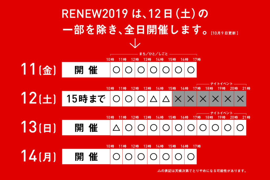 RENEWは実施いたします。ですが、このまちのファンでいていただける皆様方の身の安全こそが、何よりも私たちにとって重要なことです。どうか無理だけはせず、万全の準備と余裕をもって、RENEWへのご来場をご検討いただけましたら幸いです。