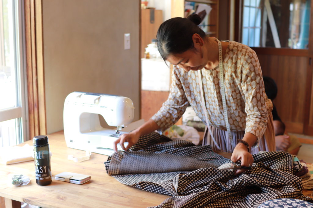 そして奥にはワークショップスペースが。取材させていただいた日は月に一度のオープンラボの日で、design labo chicaの布で下着を作っていました。
