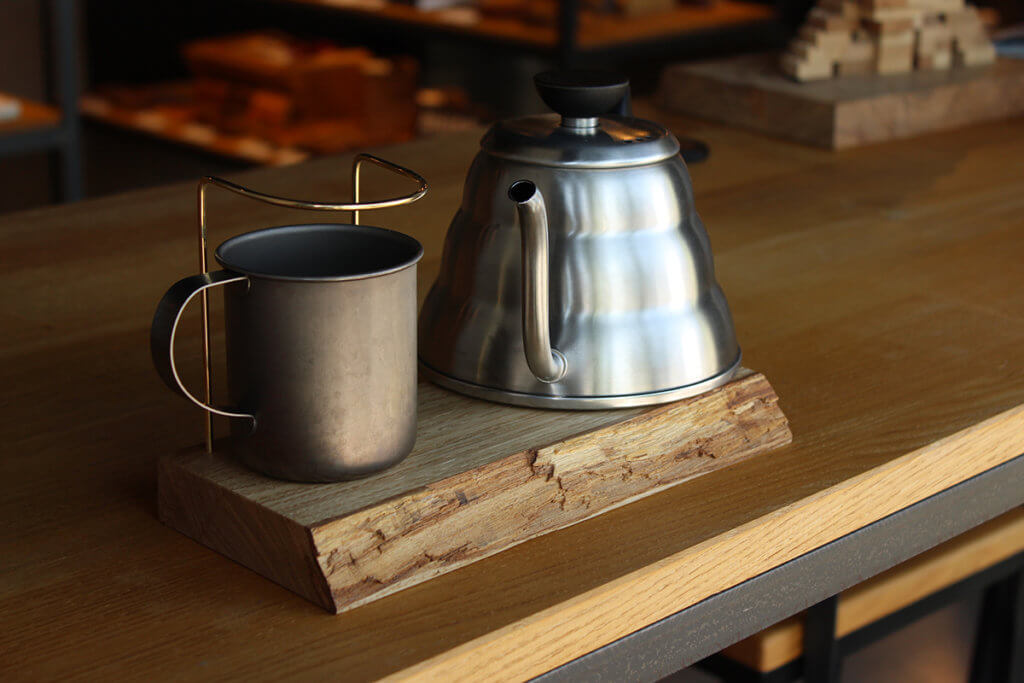 カフェ気分を味わえるドリップスタンド。自分で見定めた木の部位を切り出し製作。お気に入りの木目に愛着が増します。