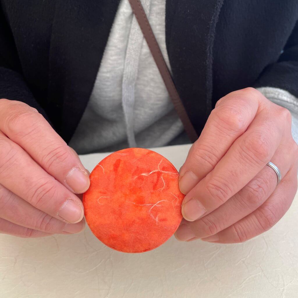 お絵かき感覚で箔押しが楽しめるワークショップ。電熱タイプのペンで箔の上から文字やイラストを描いてオリジナルコースターを作成できます。