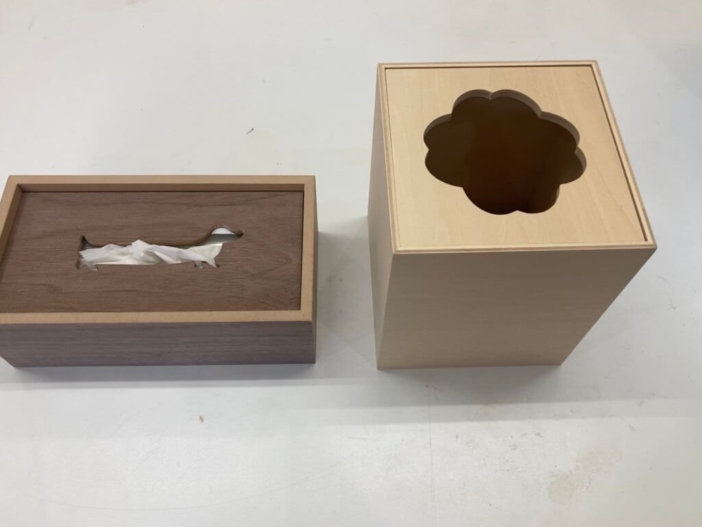 SDGsがテーマの合板の端材を使って、15cm-角のダストボックスとテッシュボックス作り。