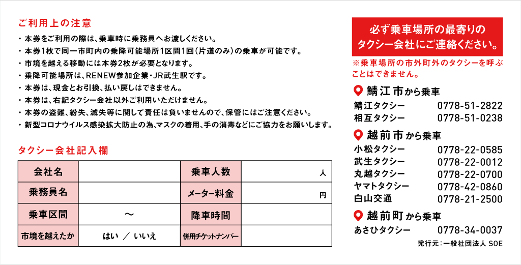 越前市内の指定乗降可能場所間を500円でタクシー移動できるチケットです。