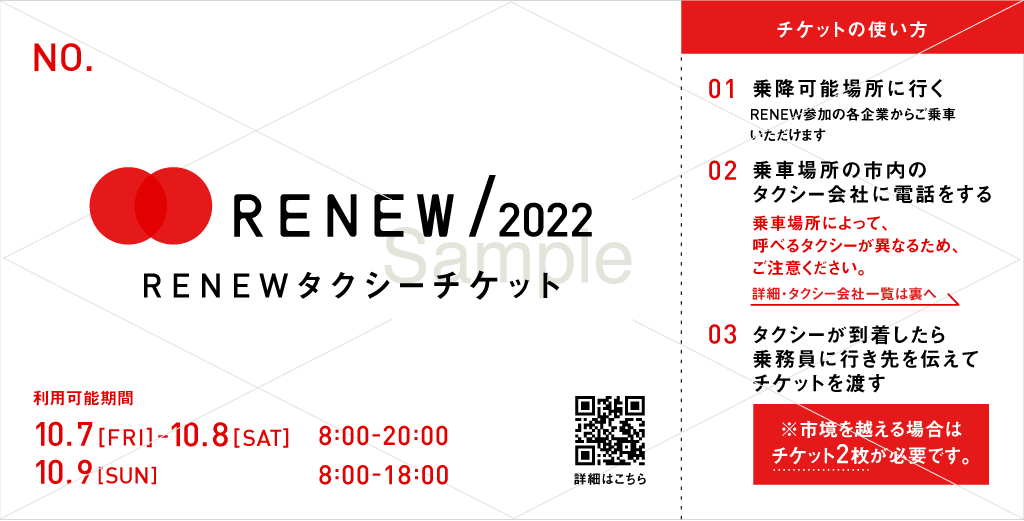 RENEW参加企業間を500円または1,000円で移動できる『RENEWタクシーチケット』を3日間限定で運用します。