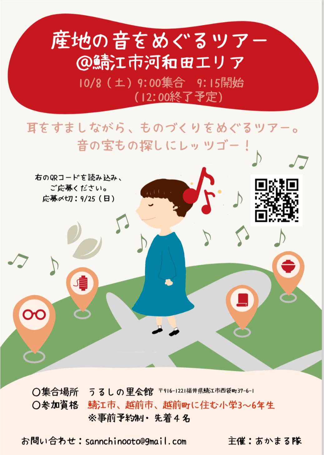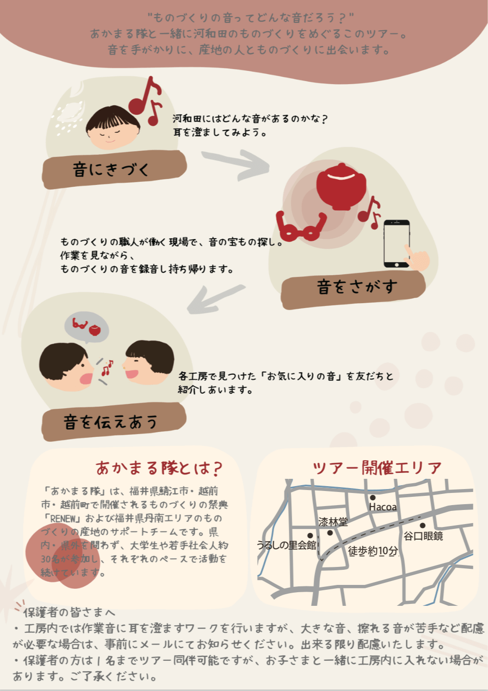 子どもたちが産地を歩いて、いろんな職人さんとお話をしたり、工房の中でいろんな音を見つけていく。そんな宝探しのような時間の中で産地を好きになるツアーを作ってみました。音の宝物をあかまる隊と一緒に見つけませんか?