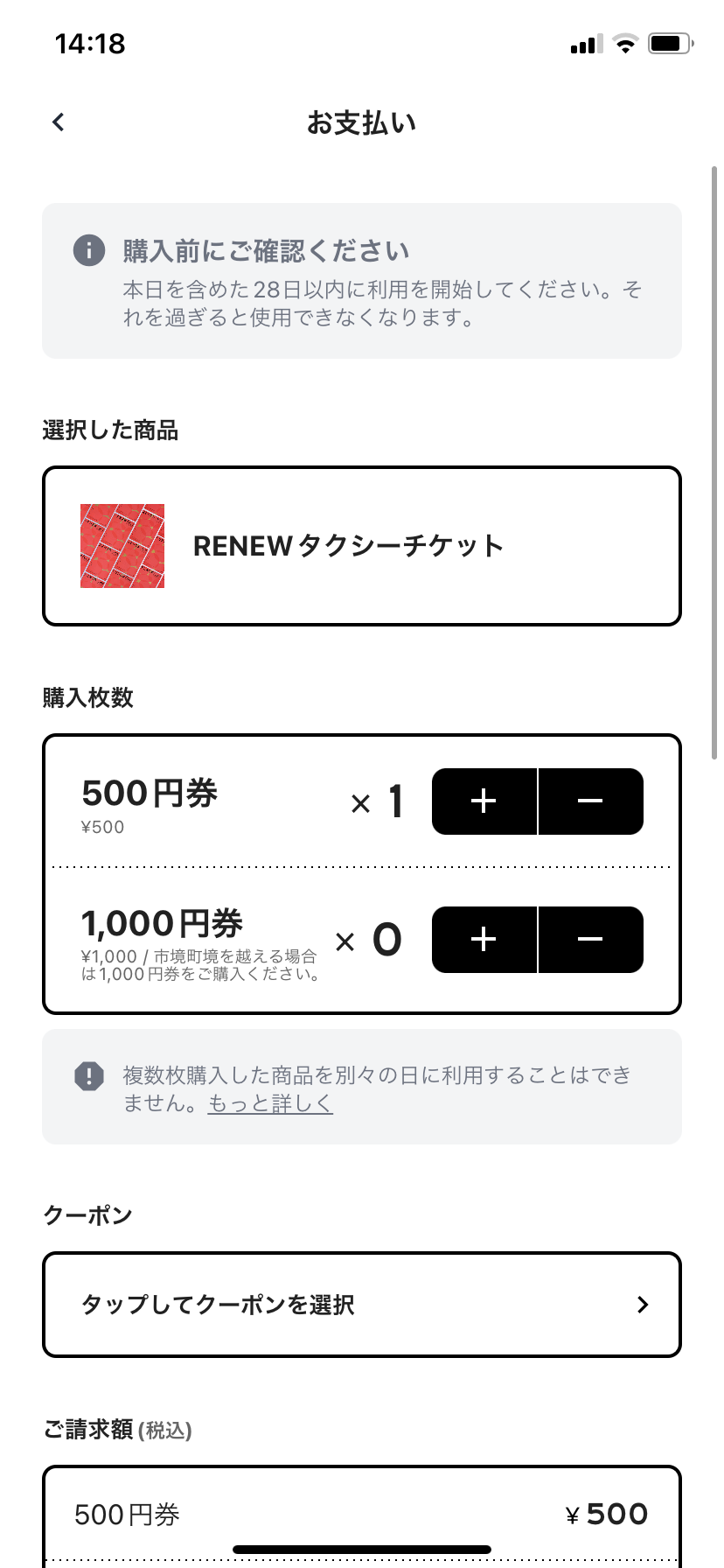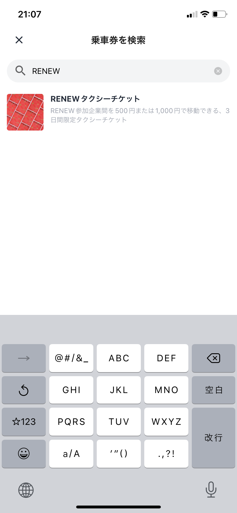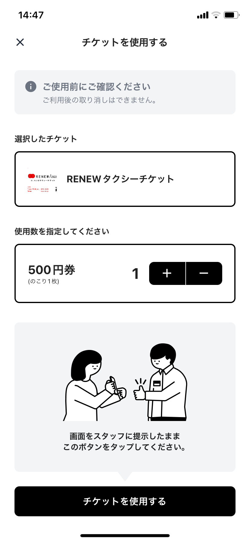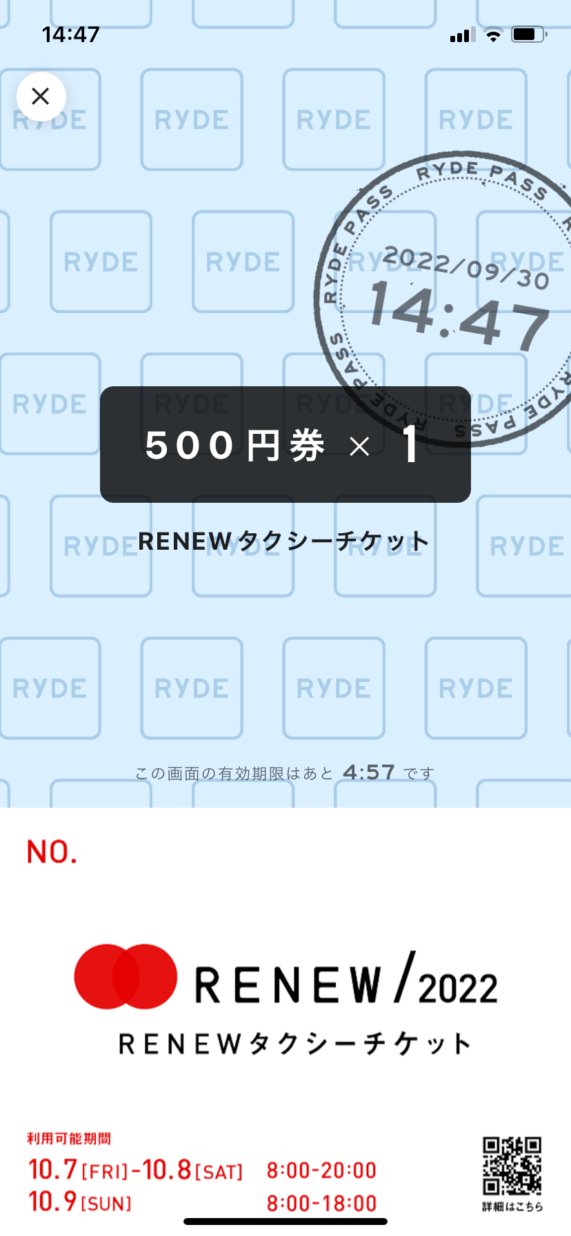 RENEW参加企業間を500円または1,000円で移動できる『RENEWタクシーチケット』。