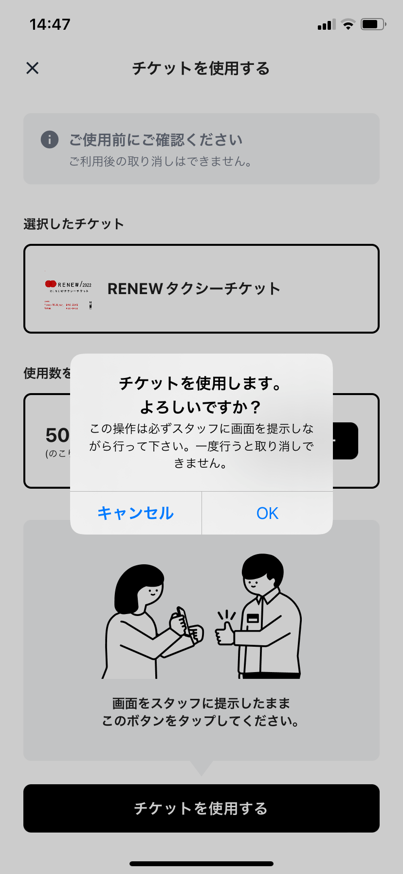・道路でタクシーを見つけての利用はできません。RENEWタクシーチケットを利用の際は、必ず電話でタクシーを呼んでください。