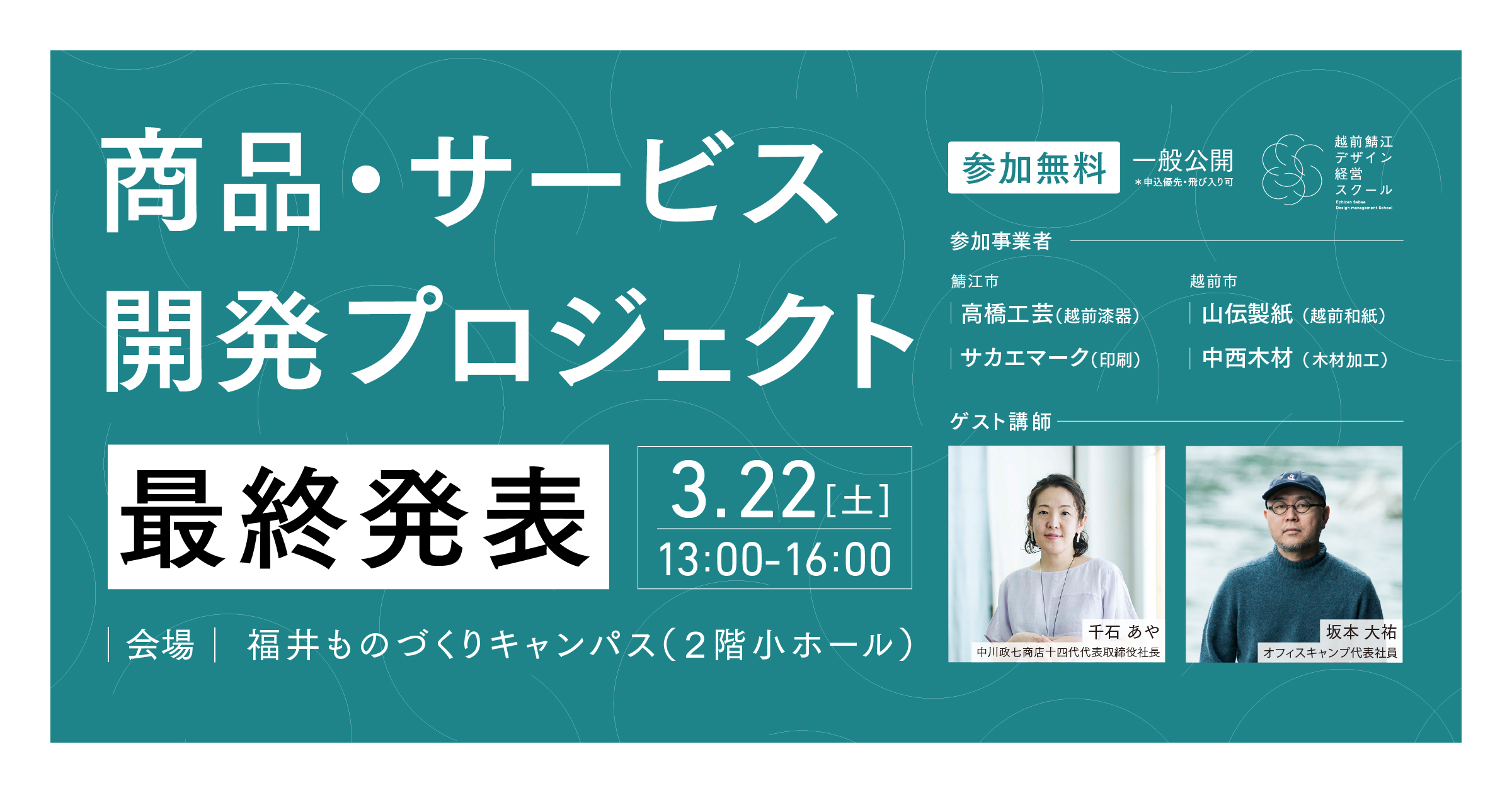 そのメインプロジェクトとなる、半年間に渡って事業者と右腕人材がチームとなって事業者の課題に取り組む「商品・サービス開発プロジェクト」が、いよいよ3/22に「最終発表会」を開催します。