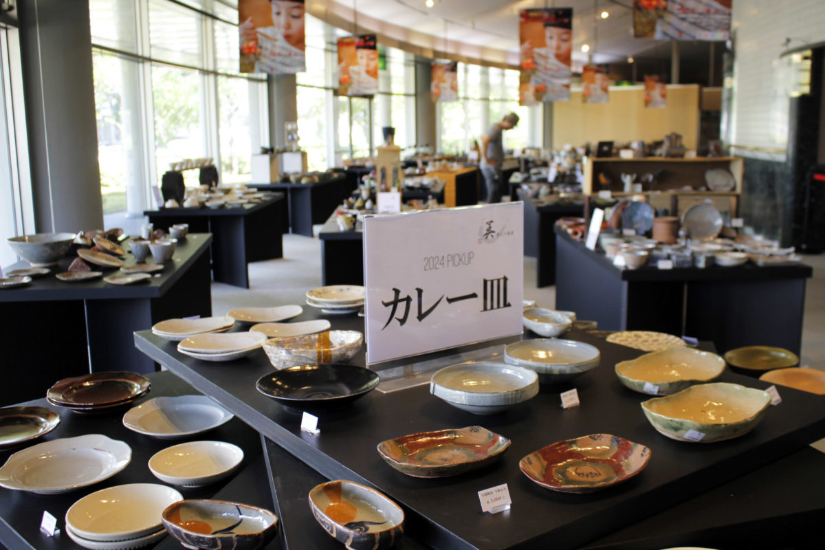 陶芸村の黄色い建物「越前陶芸村文化交流会館」では、お好みの越前焼作家のカップを選んで、セルフでコーヒーやココアを楽しめるコーナー「越前焼で珈琲時間」が人気です。四季折々の陶芸公園を眺めながら、ゆったりとおくつろぎください。同じくロビーでは、季節に合わせた様々な越前焼の企画展示や販売会を開催しています。