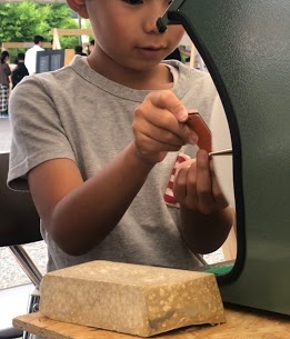 端材にやすり掛け・バフ掛けをした後、記念の金色箔押しをします。穴に紐を通してキーホルダーにできます。