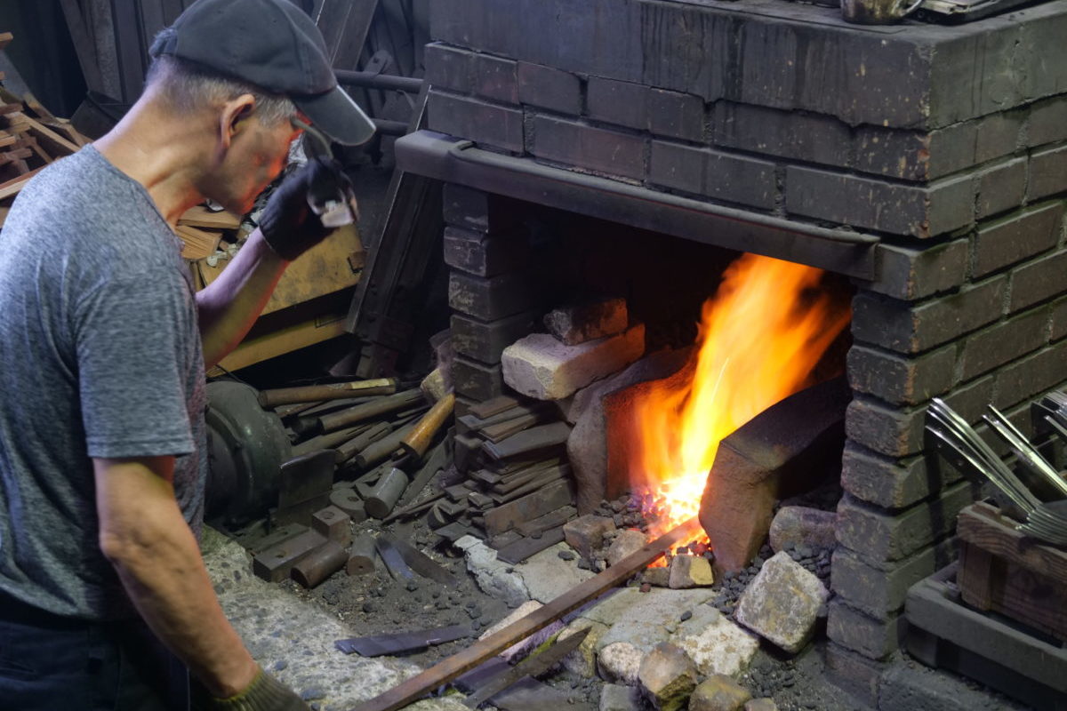 鉄を赤めて叩いて伸ばす体験をします。伝統工芸士が隣でサポートします。刃物職人の体験ができる滅多にない機会です。