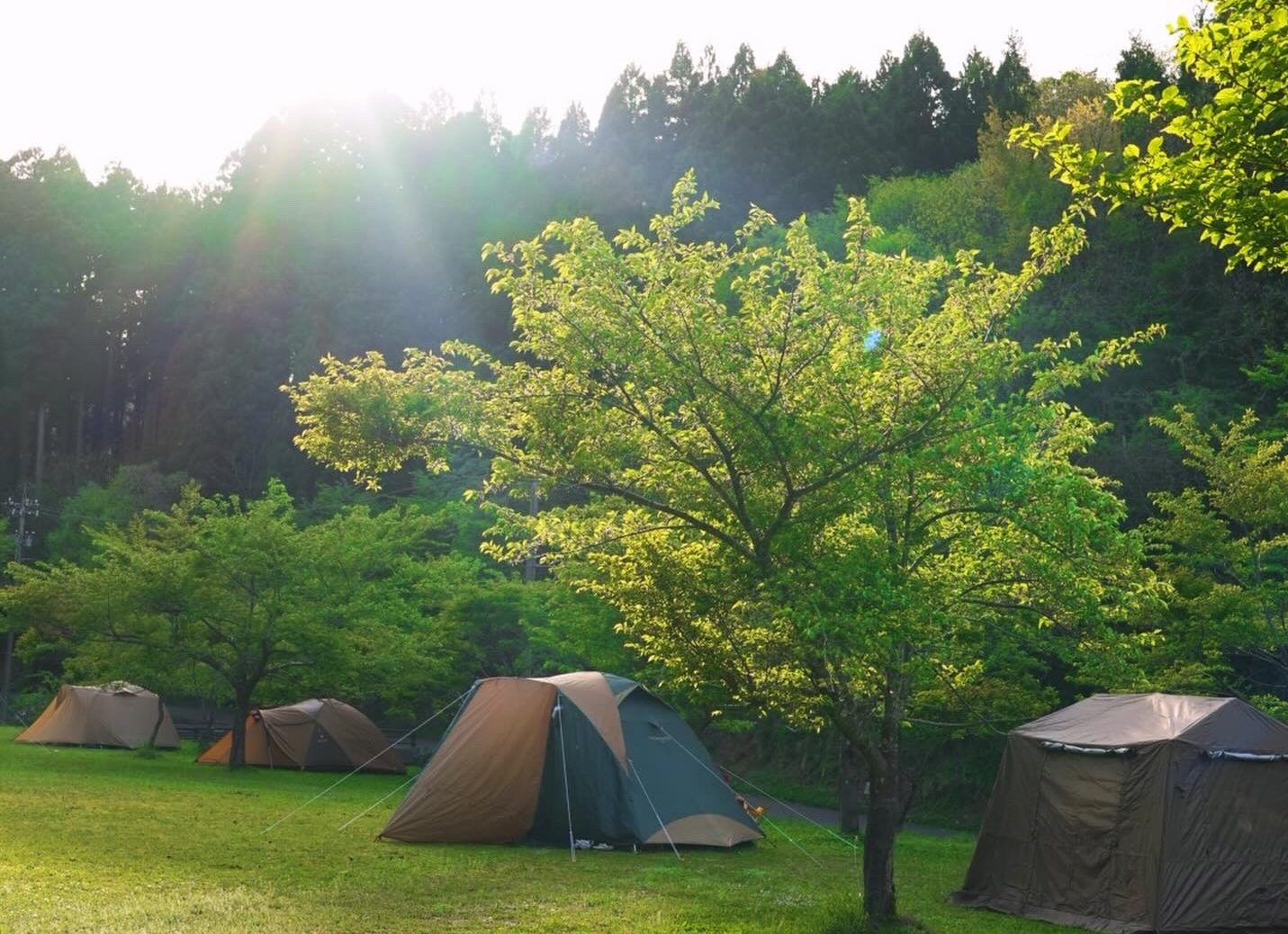 情緒ある古民家風茅葺屋根の宿、静かな自然の中にたたずむコテージに加え、広大な芝生エリアでゆったりのんびりキャンプサイトが新たにオープンしました。