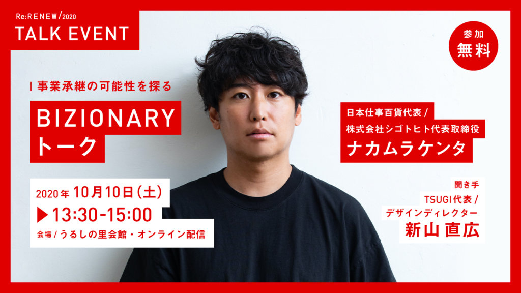 後継者のいない会社が増加するなか、日本仕事百貨が始める新たな事業継承プロジェクト「BIZIONARY」。日本仕事百貨・ナカムラケンタ氏と、RENEWディレクター・新山直広をゲストに、既存の事業を活かしながら、地域に仕事を生み出していく可能性を模索します。