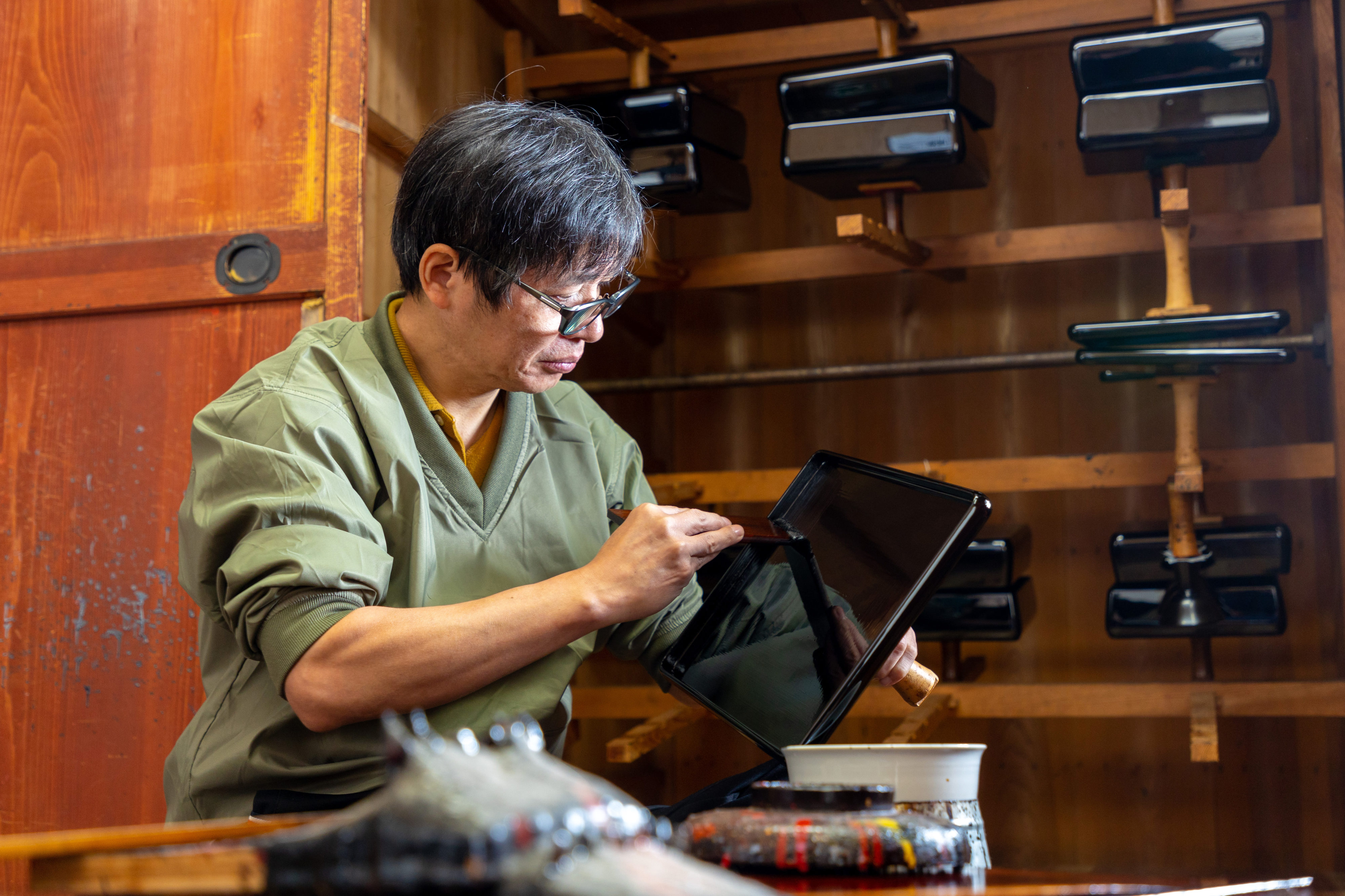 福井県鯖江市河和田を中心とする越前漆器は、その地域全体で分業体制が確立しており、素地作りや塗り、加飾など様々な工程を高度に専門化することで美しく堅牢な作品を生産しています。