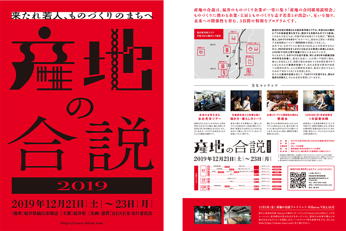 12/21-23、福井県丹南エリアで採用を考える工房・企業が集うものづくりの合同企業説明会「産地の合説」の開催が決定!そのプレイベントを11/1(金)、東京にて開催します。