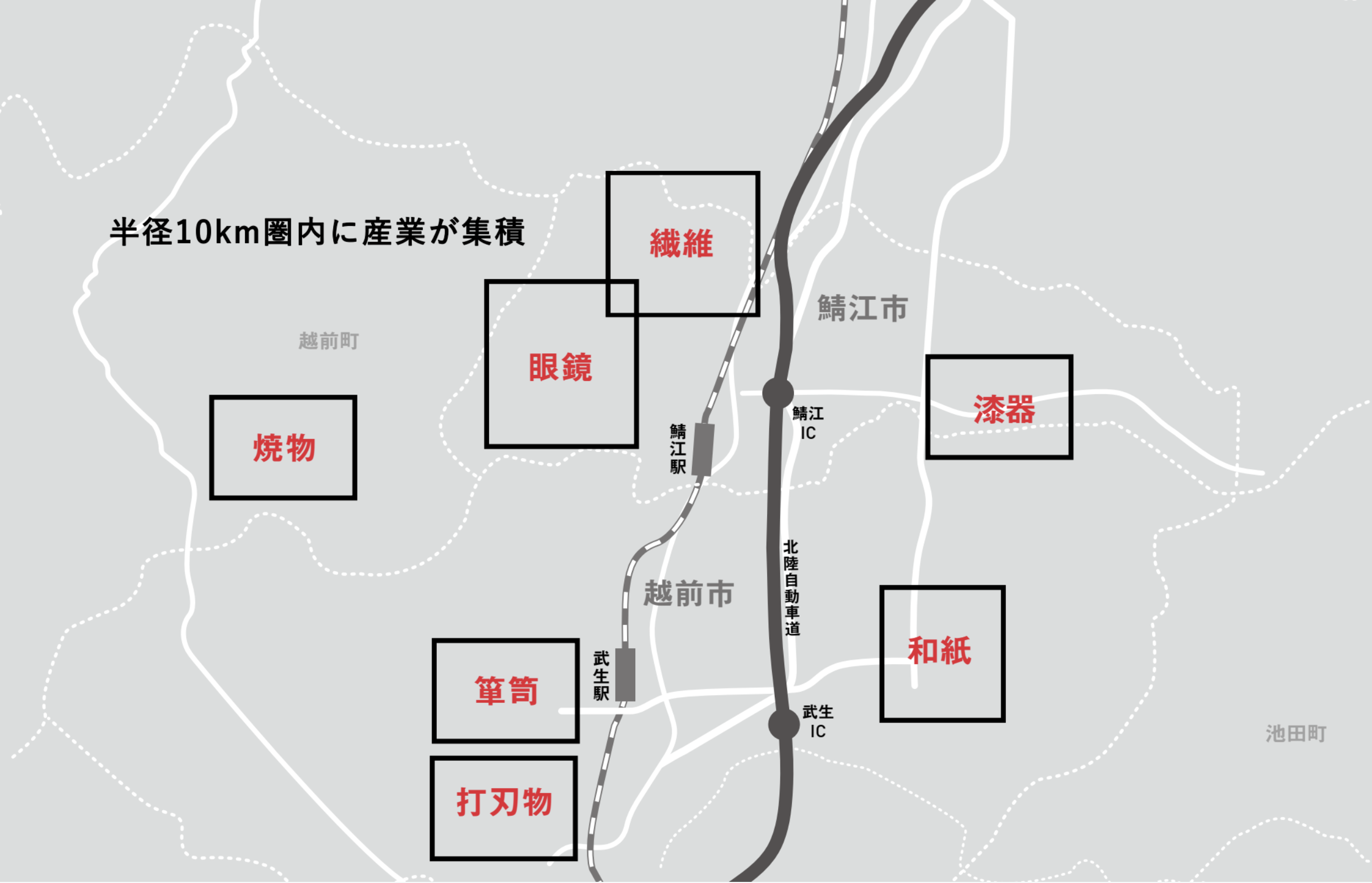 ここ福井県丹南エリアは、半径10km圏内に7つの地場産業を有する、国内でも有数のものづくりのまち。越前漆器、越前和紙、越前箪笥、越前打刃物、越前焼の5つの伝統産業に加え、メガネと繊維の2つの地場産業を有しています。