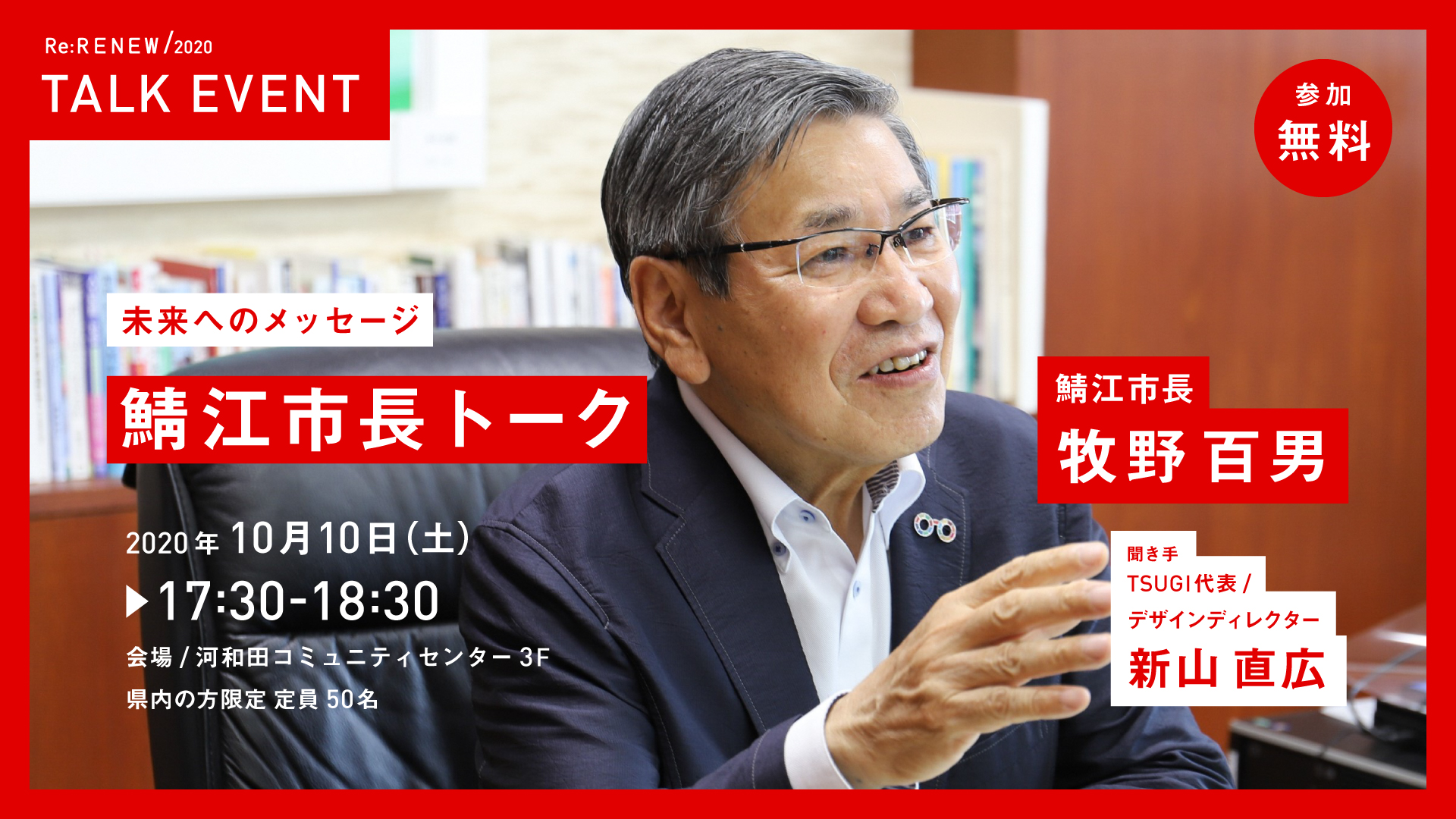 4期にわたり市政を担ってきた鯖江市長・牧野百男氏によるトークイベントを開催。「鯖江市役所JK課」や「ゆるい移住」をはじめ、学生連携や市民協働の領域で全国をリードしてきた16年間を振り返りながら、未来の鯖江を担う世代へ向けたメッセージを伝えます。
