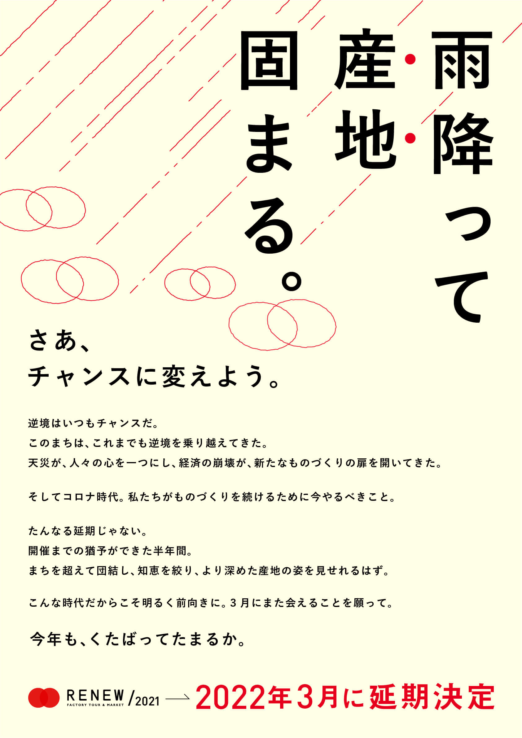 RENEWは、現地に来ていただくことが本来の姿です。ものづくりの現場で、多くの方に見て触れて体験していただくことで、より地域の発展につながっていくと考えています。そのため、コロナウイルスの感染拡大が落ち着いて、天候にも左右されづらいであろう2022年3月の開催を決定いたしました。