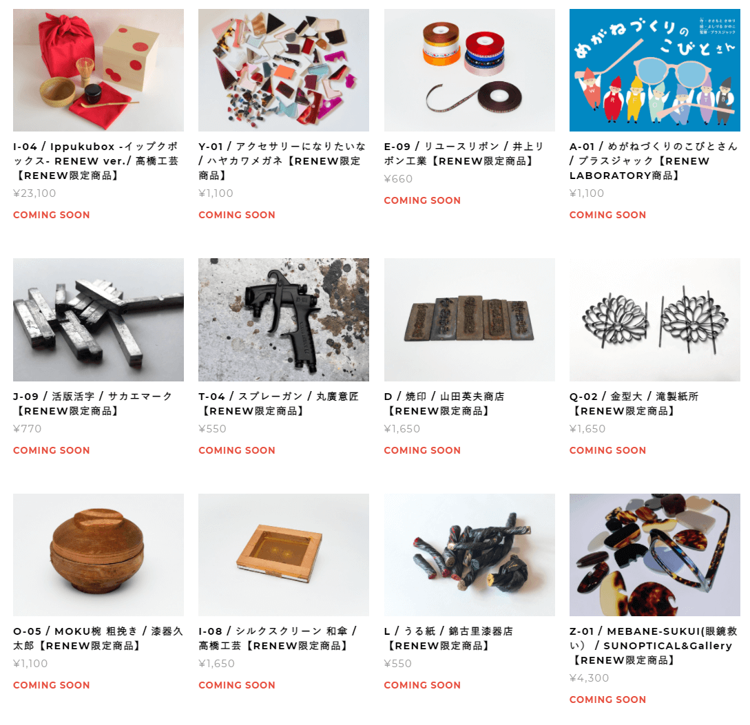 RENEW STOREは参加企業の自社商品をはじめ、製作の際に出た端材や、使わなくなった職人の道具など、RENEWならではのバラエティに富んだ商品が目白押しです。今年はRENEWの現地開催が3月に延期になりました。そこで、開催を楽しみにしていたお客様に少しでもRENEWを感じてほしいという思いから、急遽オンラインショップを行うことになりました。