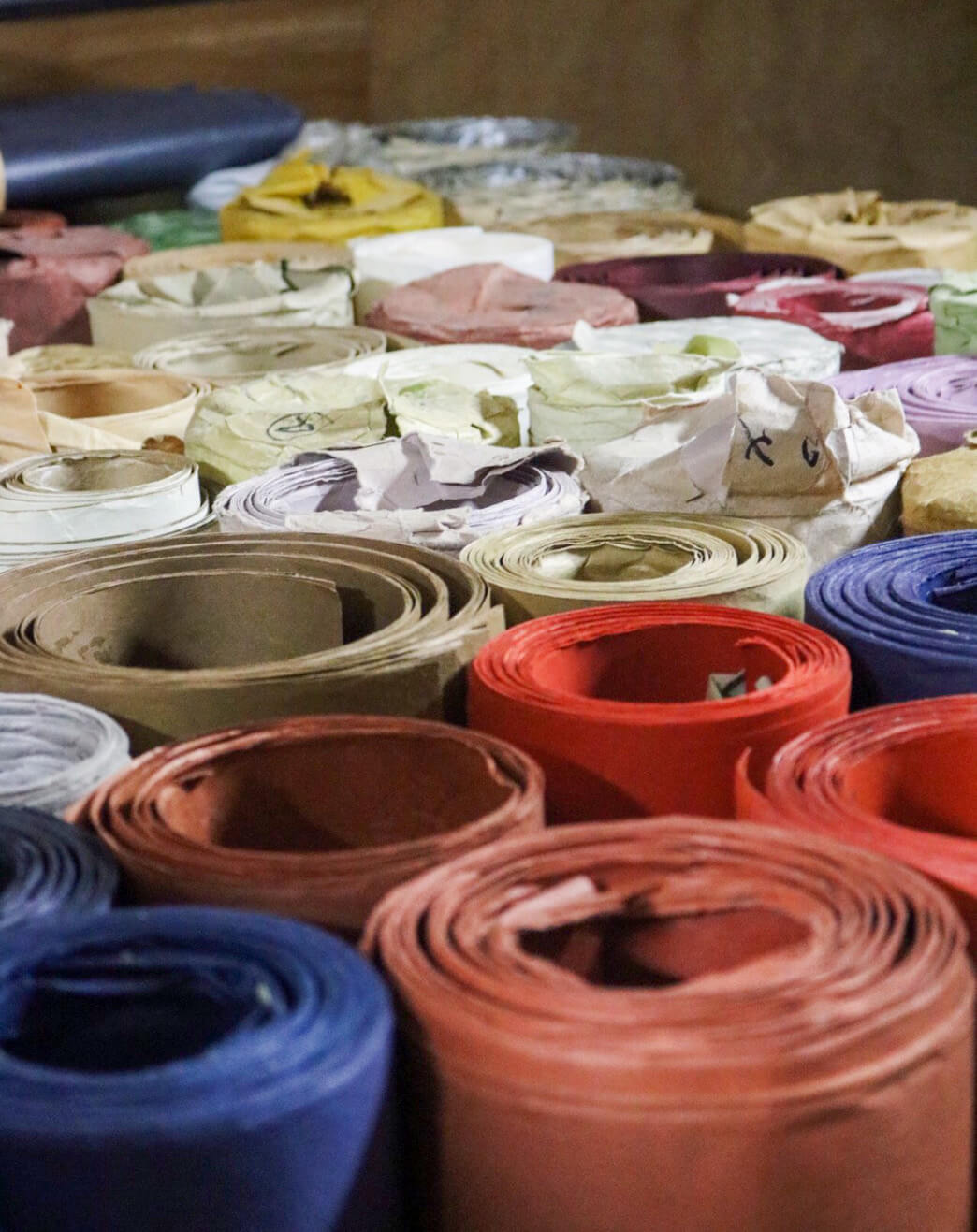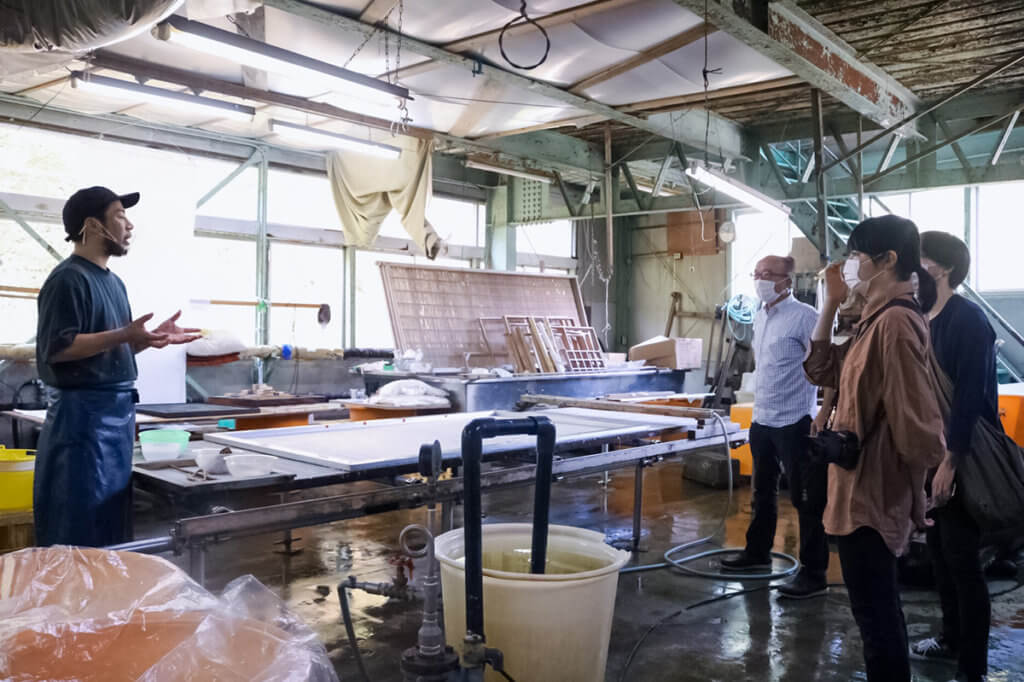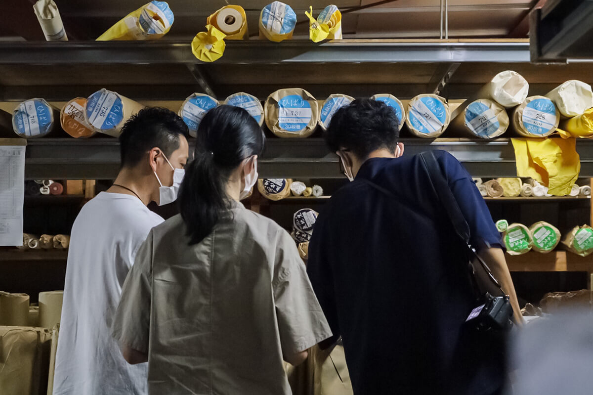 こちらは和紙の問屋である「山岸和紙店」。これまであまりお客様を案内することのなかった倉庫に潜入!色とりどりの和紙ロールが並ぶ様は見応え抜群。なかなか見ることの出来ない光景に参加者も思わず前のめりに。