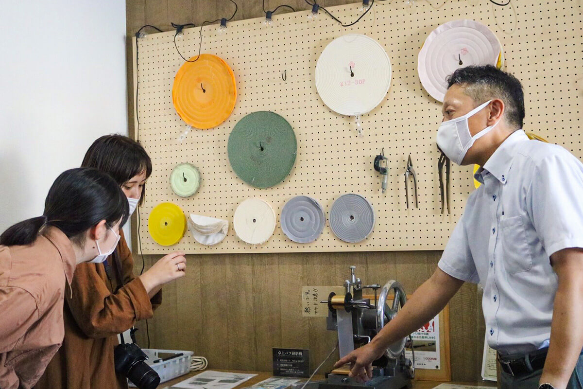 工房だけでなく、ものづくりを支える卸業者も参加。写真は眼鏡に関する機械や工具などを扱う企業の「晃梅」。2階には展示のように様々な眼鏡の工具が並べられており、ひとつひとつ丁寧に説明してくださいました。