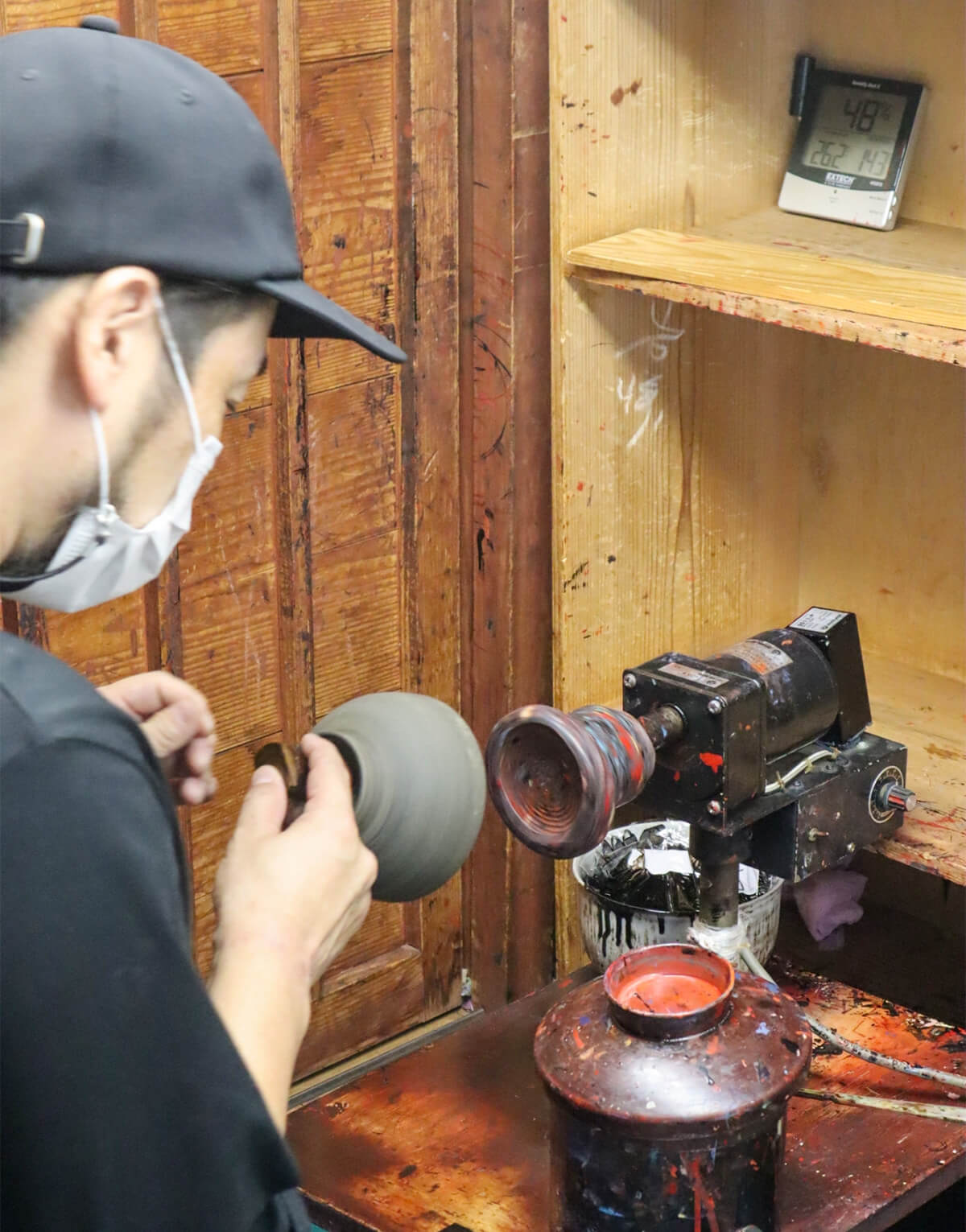 越前焼の窯元「風来窯」で工房見学をする職人さんとあかまる隊。