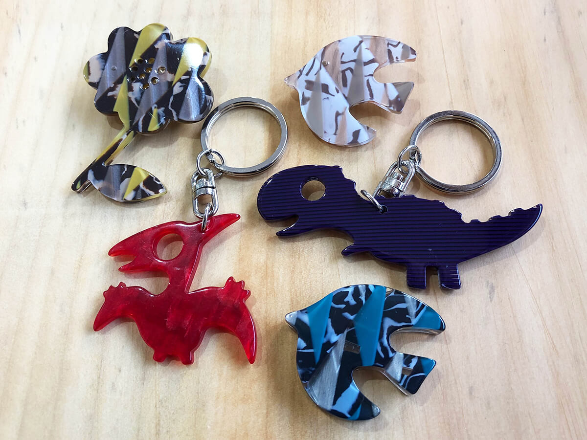 自由に描いたモチーフをメガネの素材・植物性樹脂セルロースアセテートを加工し、キーホルダーにできます。
