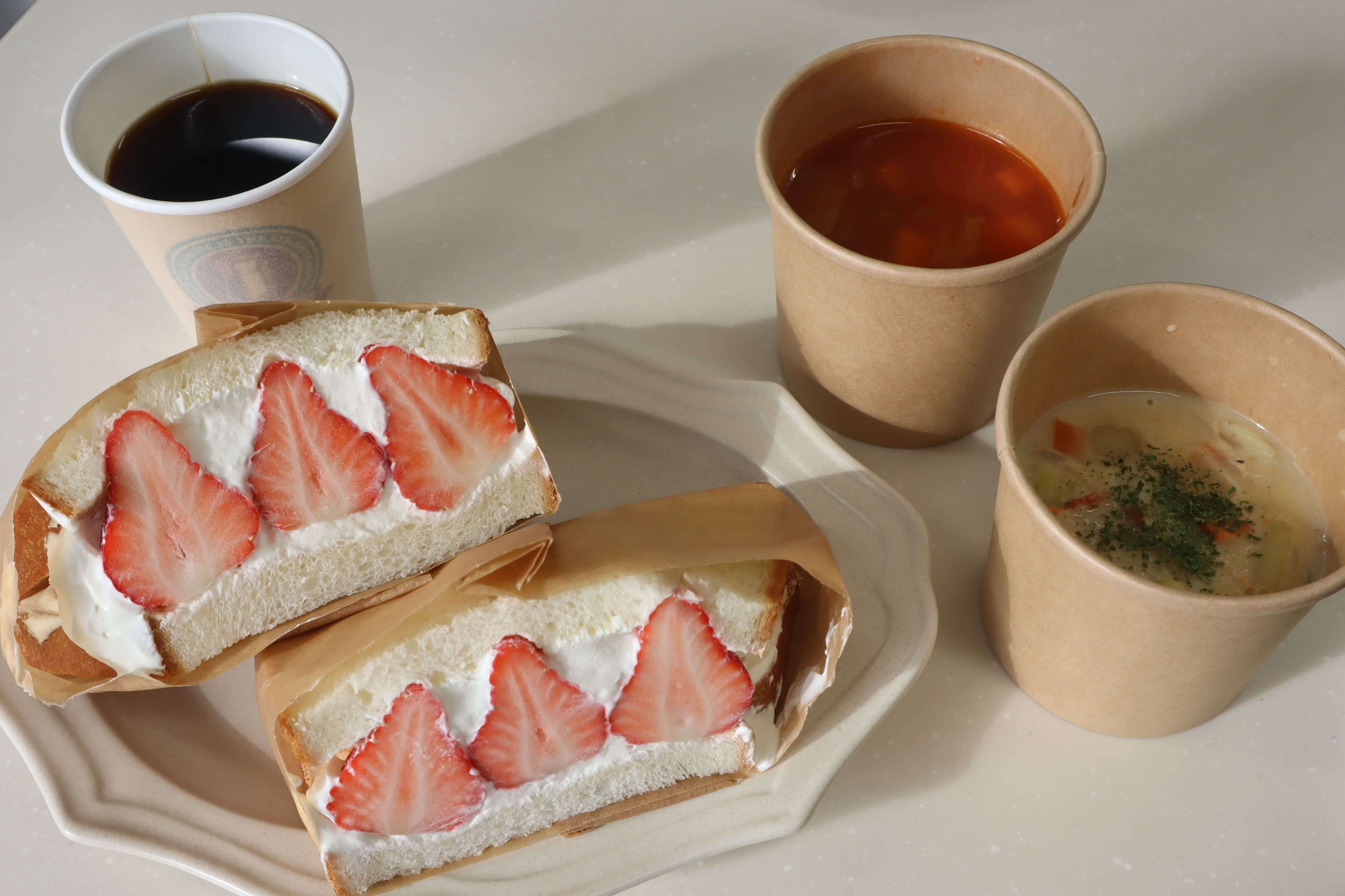 あかまる隊がカフェをRENEWに初出店!それぞれのメンバーの得意を活かし、食を通してRENEWを盛り上げます。あかまる隊カラーをイメージし、地元食材を使用した温かいスープやコーヒー、いちごサンドを数量限定で販売中!