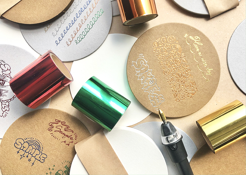 お絵かき感覚で箔押しが楽しめるワークショップ。電熱タイプのペンで箔の上から文字やイラストを描いてオリジナルコースターを作成できます。
