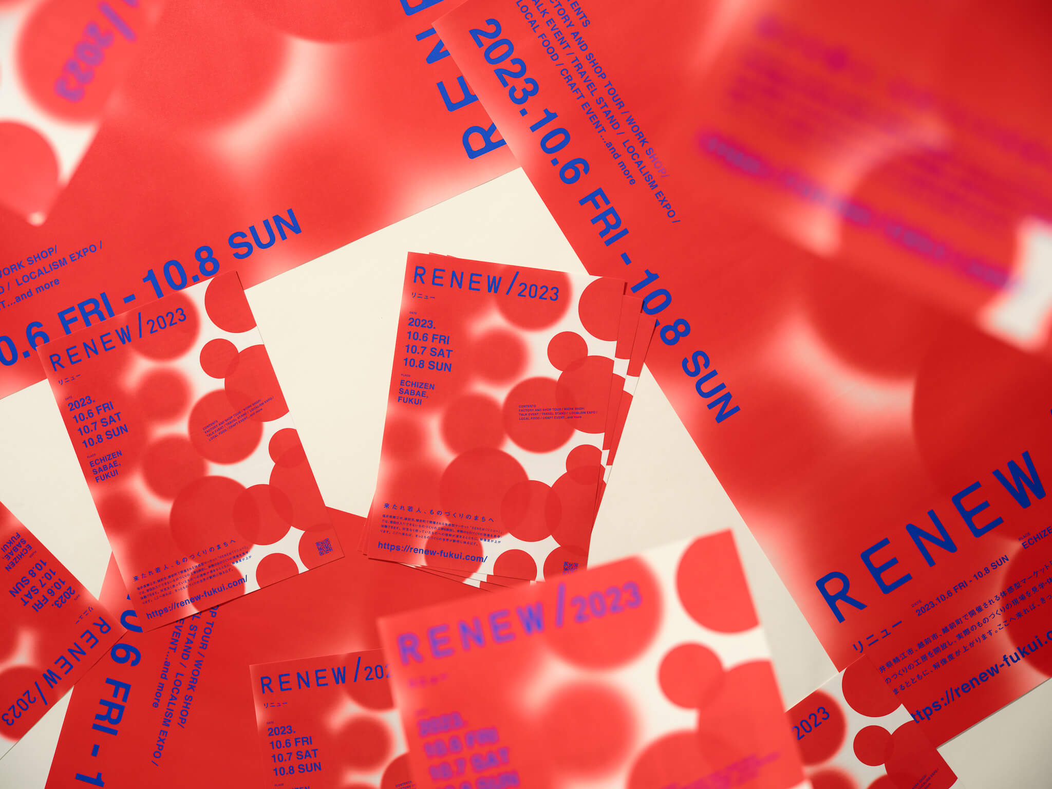 ものづくりの現場を実際に訪れて空気感を味わうことで、ぼんやりとしていたものづくりのイメージが、はっきりと鮮明にあなたの目に映ります。RENEWへ訪れる前と後では、ものの見方やものづくりへの理解が格段に変わり、解像度が高まる。そんな様子を表現したメインビジュアルには、第9回目のRENEWもより解像度の上がる体験を提供できるようにという思いを込めています。今までにないブルーのアクセントを使用し、今年もまだまだ新たな側面を見せられるようにという願いも込めました。