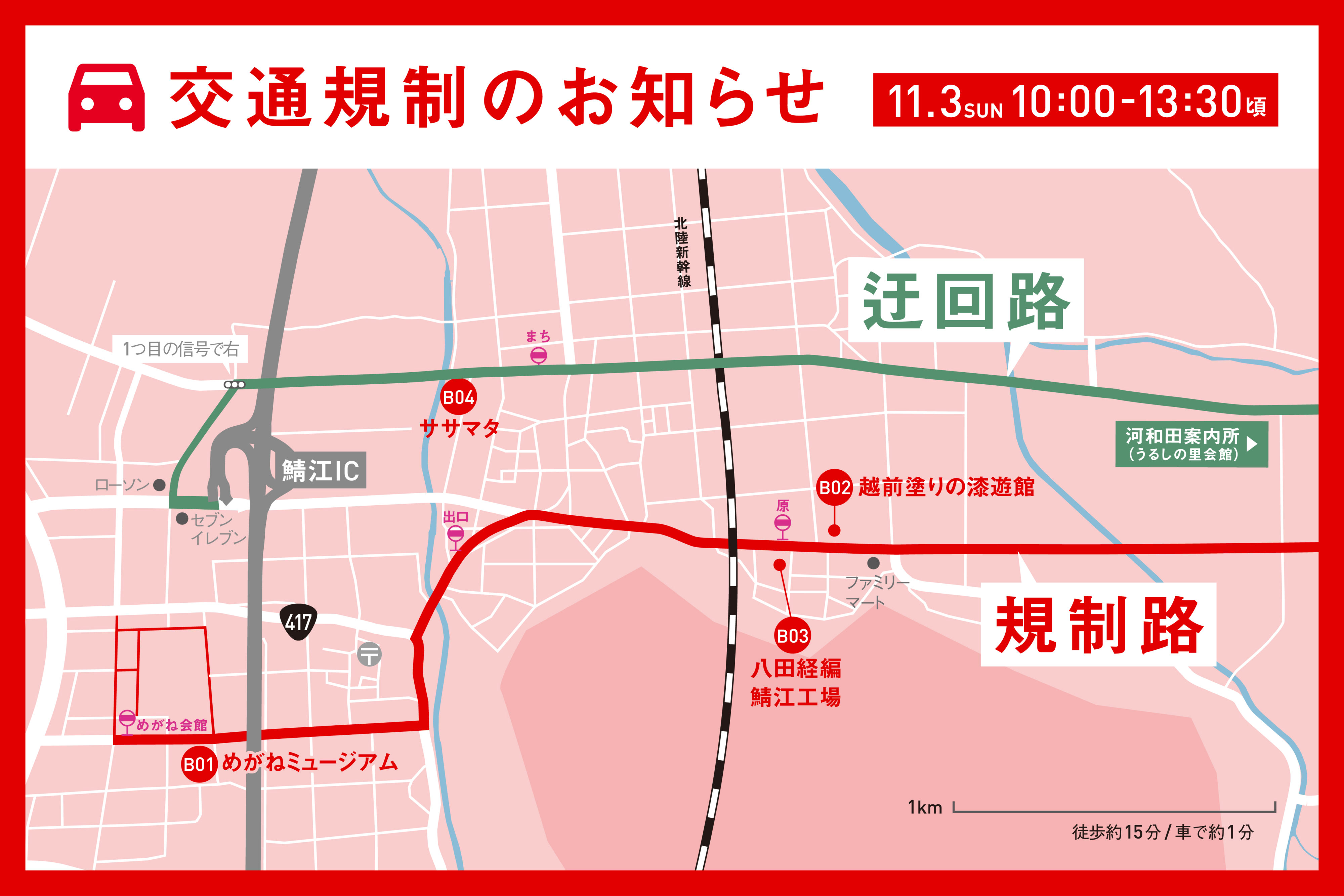 大会の実施に伴い、コースとなる鯖江市総合体育館~うるしの里通り川島町信号まで一時通行止めが行われます。