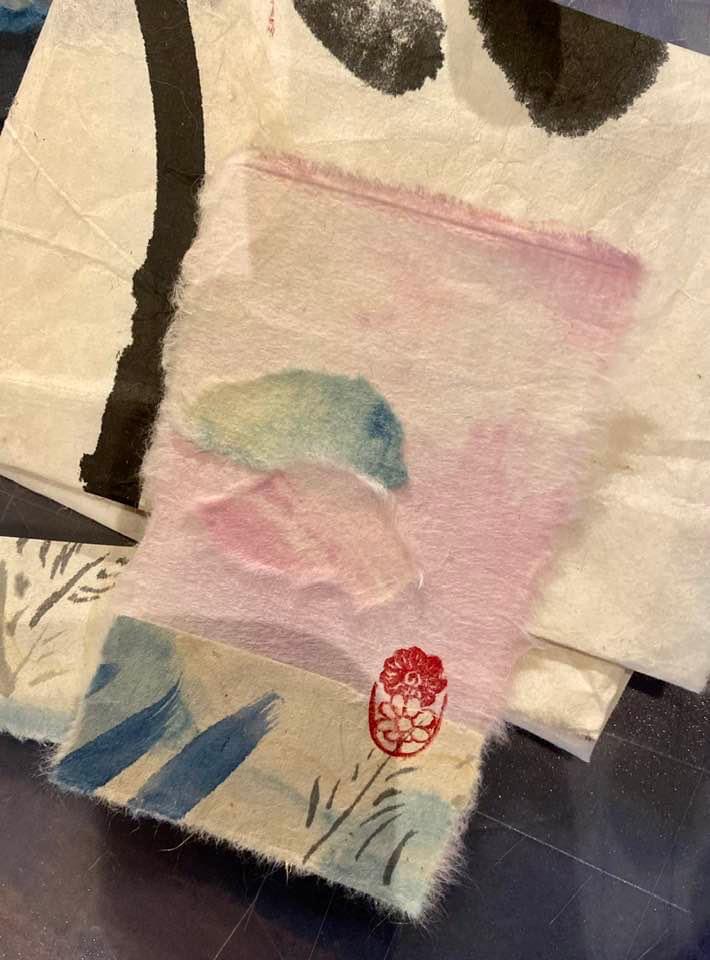 A3程度の和紙を漉き、そこに引っ掛け技法で柄付けし、乾燥させます。