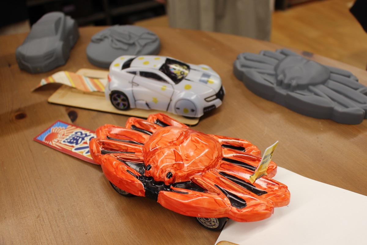 カーデザイナーとして多くのクルマを世に出してきた経験を活かして、レーザーカッターで作った車体と、3Dプリンターで作った部品、平面が一瞬で立体になる真空成形機を使って、輪ゴムの力で走る「ダッシュ・カー」をお子様と一緒に作るワークショップを行います。