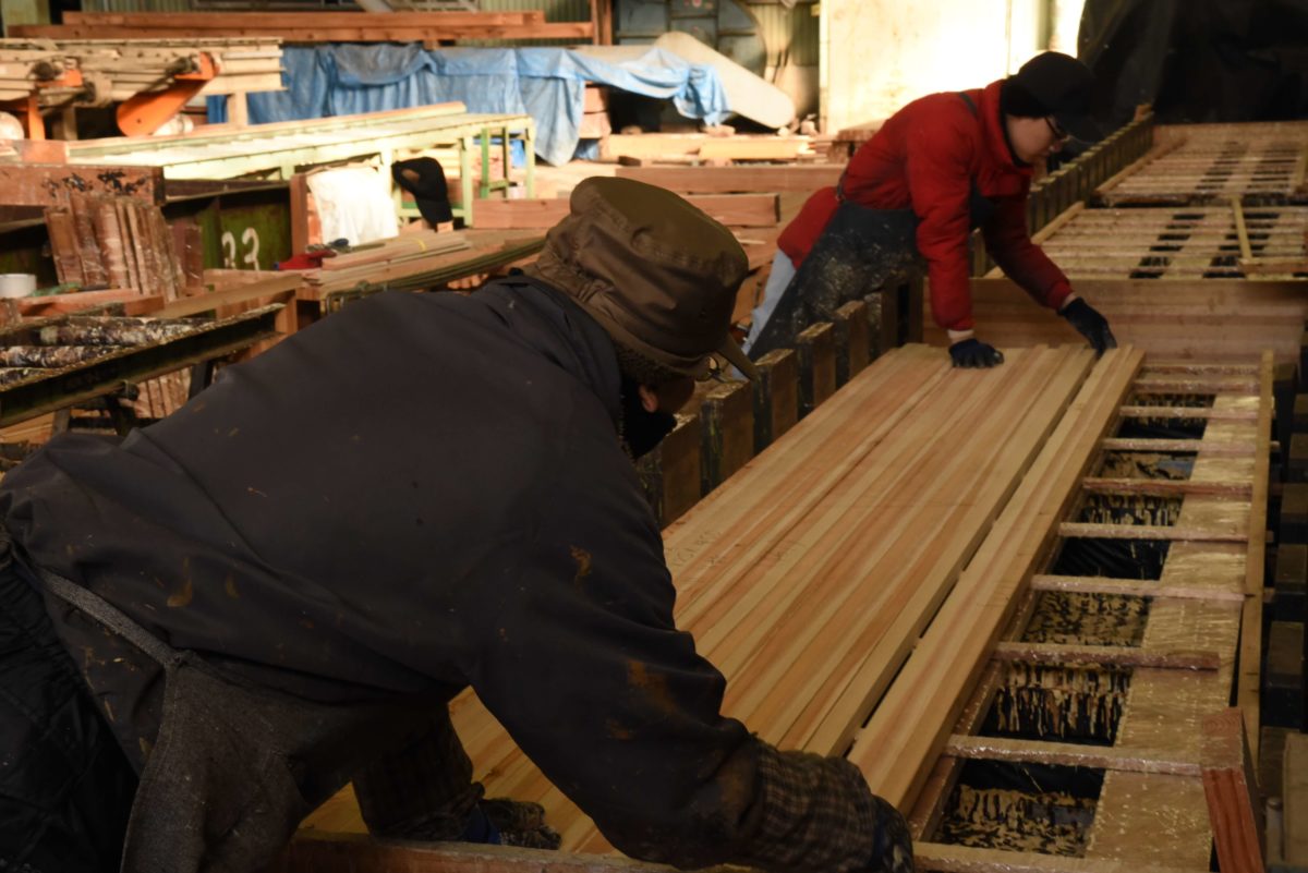 実際に山に足を運んでもらいこん棒作り体験を行います。(こん棒は持ち帰りしていただきます。)その後社内で福井県産材の杉を使った「デザインウッド」作り体験、工場見学を行います。(昼食有)