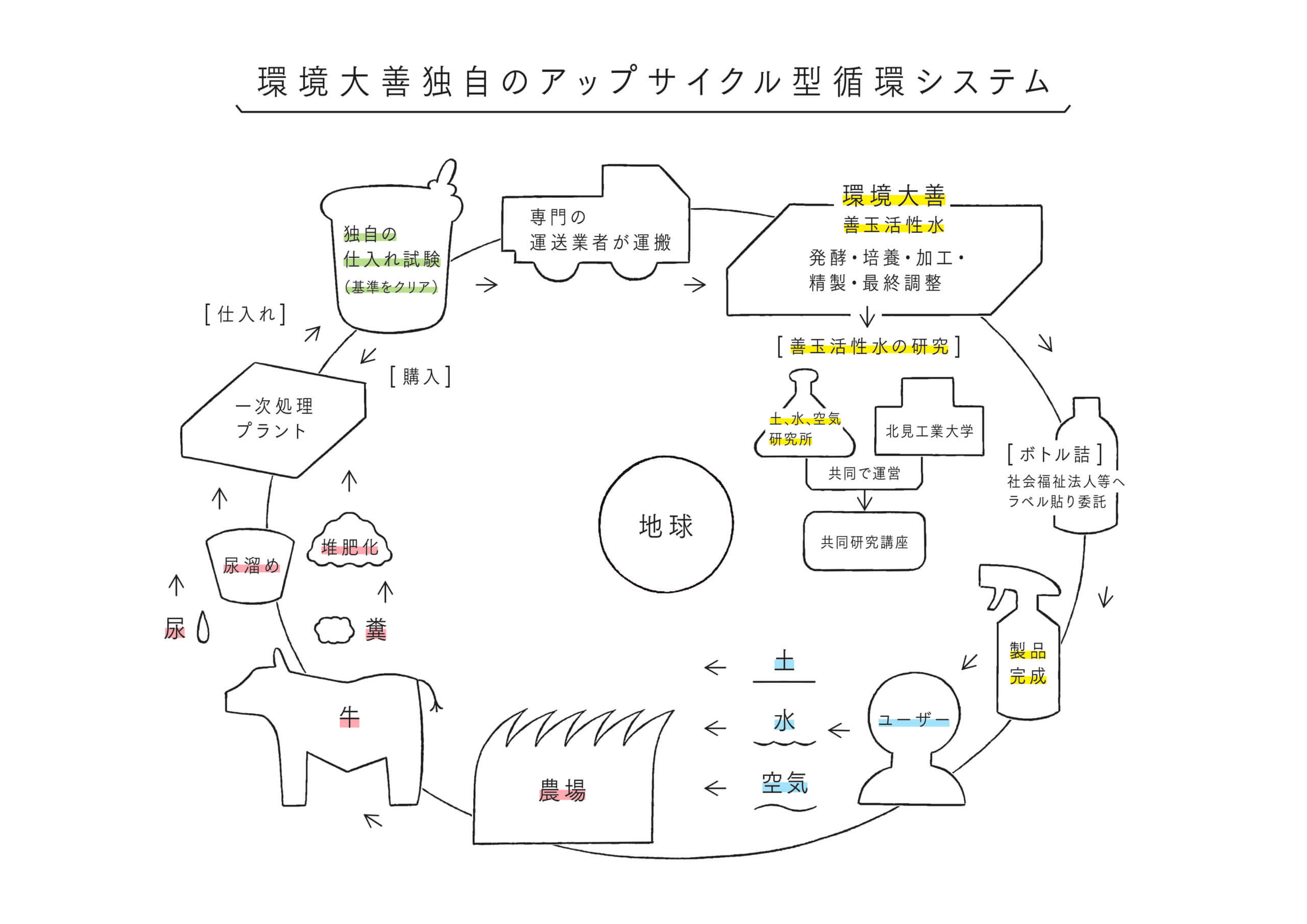 弊社は、北海道の主要産業である酪農が引き起こす水質汚染や悪臭被害の改善を目指し、発酵処理による牛尿の無害化と発酵液に含まれる機能性を活用した「善玉活性水™」の製造販売を行っております。