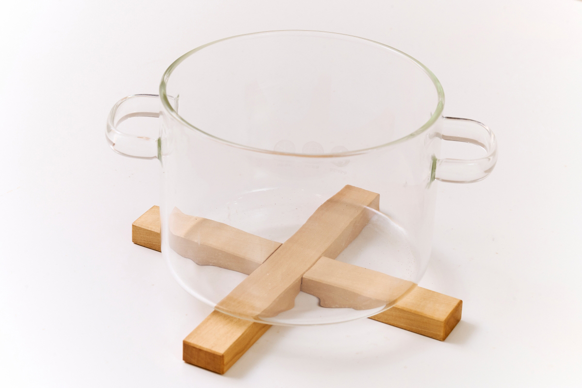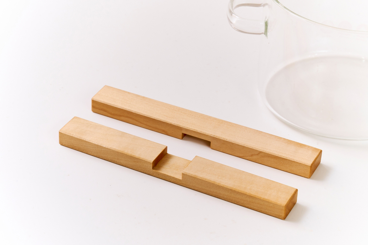 表面にペーパー掛けをして平坦にしたあと、面取りをして塗装したら完成です。クロス式の鍋敷きで、使わないときは場所を取らず、ハシ入れなどにも収納出来ます。