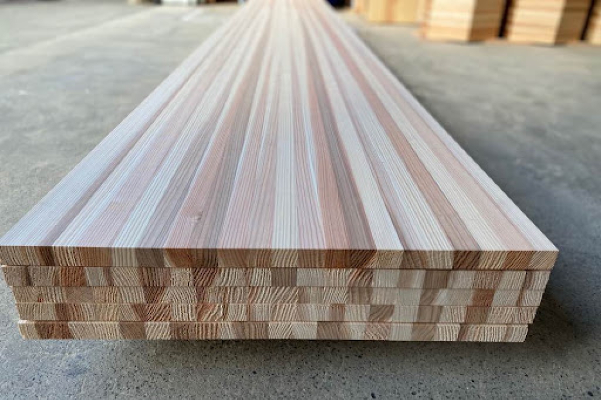 杉の集成材を組み合わせたオリジナル木材「デザインウッド」。