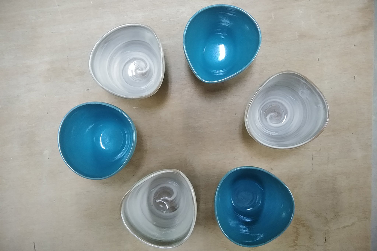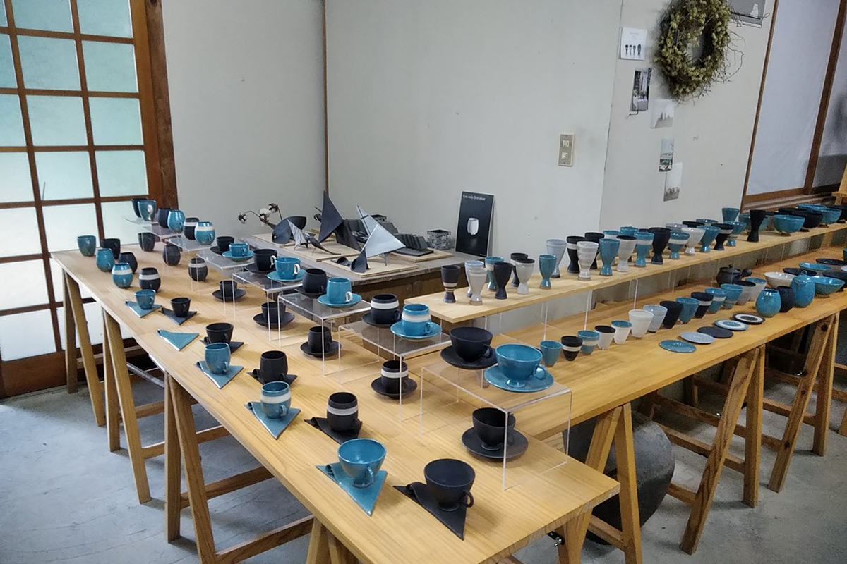 鮮やかなターコイズブルーと落ち着いたスチールグレーの色が特徴的な作品たち。越前焼ではめずらしいターコイズブルーの色は、自分が青色が好きだったことから生まれたもの。納得のいく色味を出すために自分の手で原料を調合し、試作を重ねて仕上げたこだわりの色です。