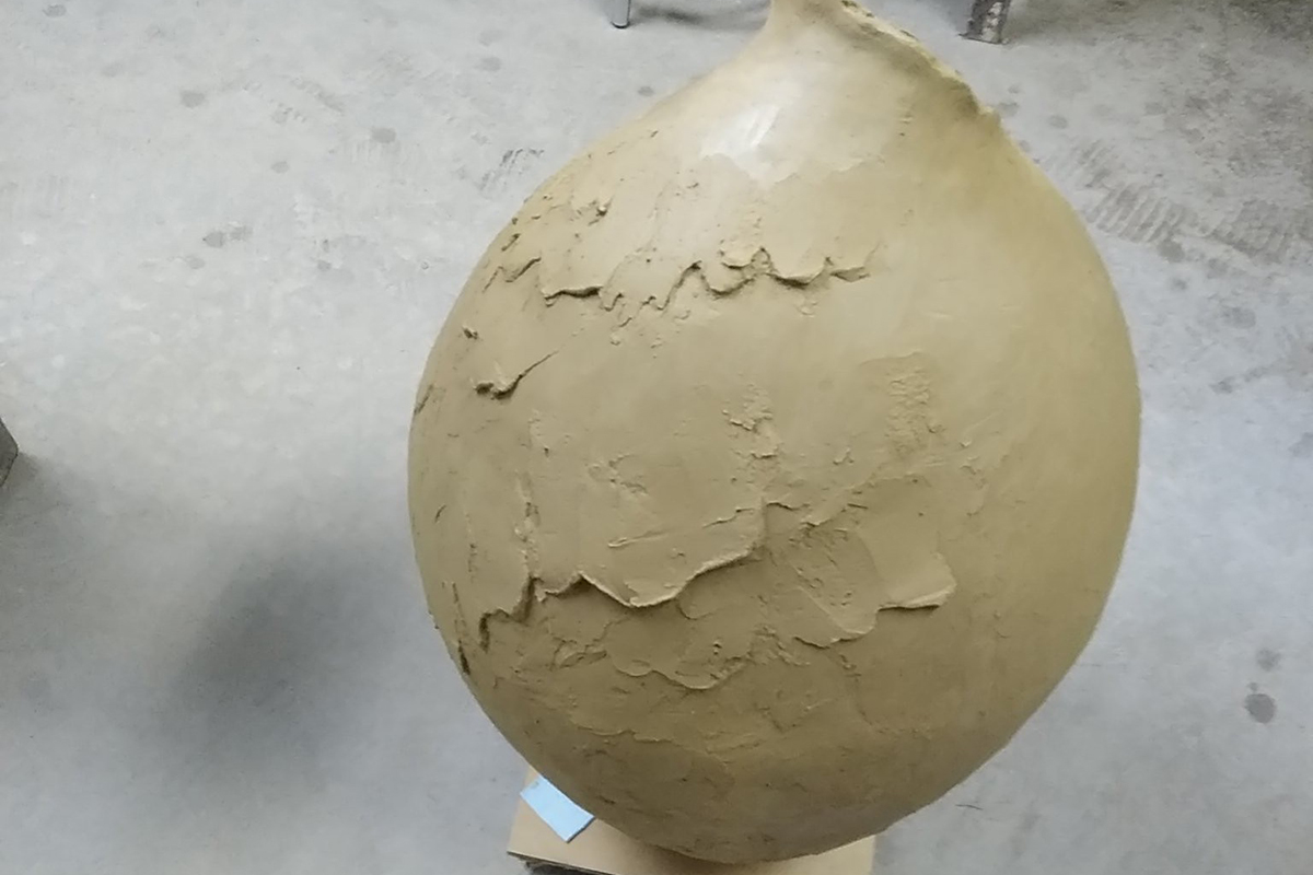 1番の特徴としてはろくろは使わず、作る人が回りながら粘土を積んでいきます。今回は1人1段粘土を積んでいき、RENEW期間中にみんなで(午前午後、各1人)6段積んで1つの作品を完成させます。(高さ30〜40cm)