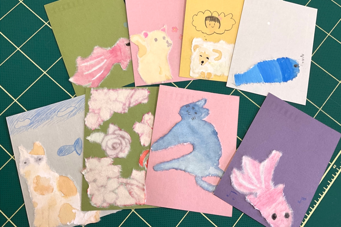 ちぎり和紙を貼り付けて、オリジナルのポストカードもつくってみましょう。水彩絵の具や、筆などを準備してお待ちしています。