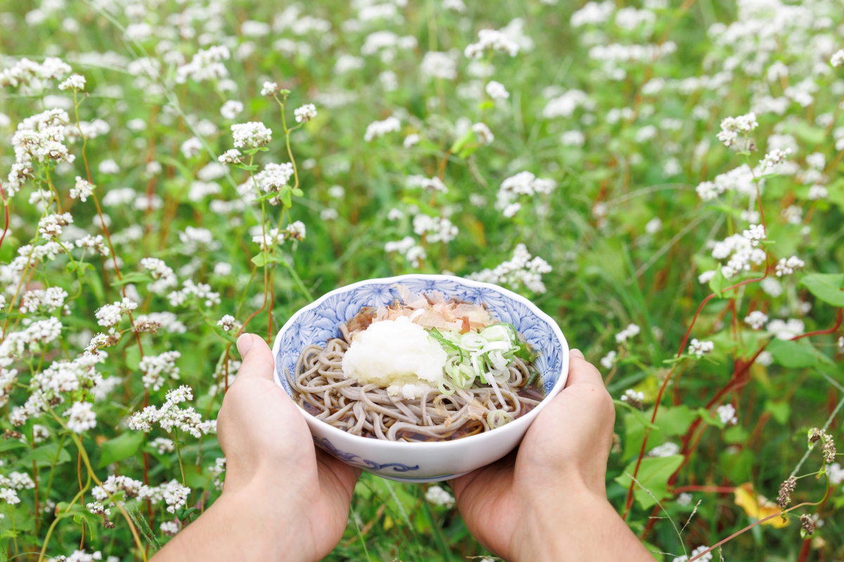 直営農場産の採れたての新そばを使用。自分で打って、食べる贅沢をお楽しみください。