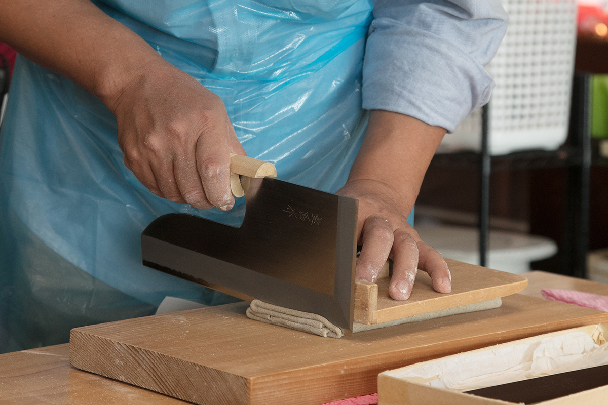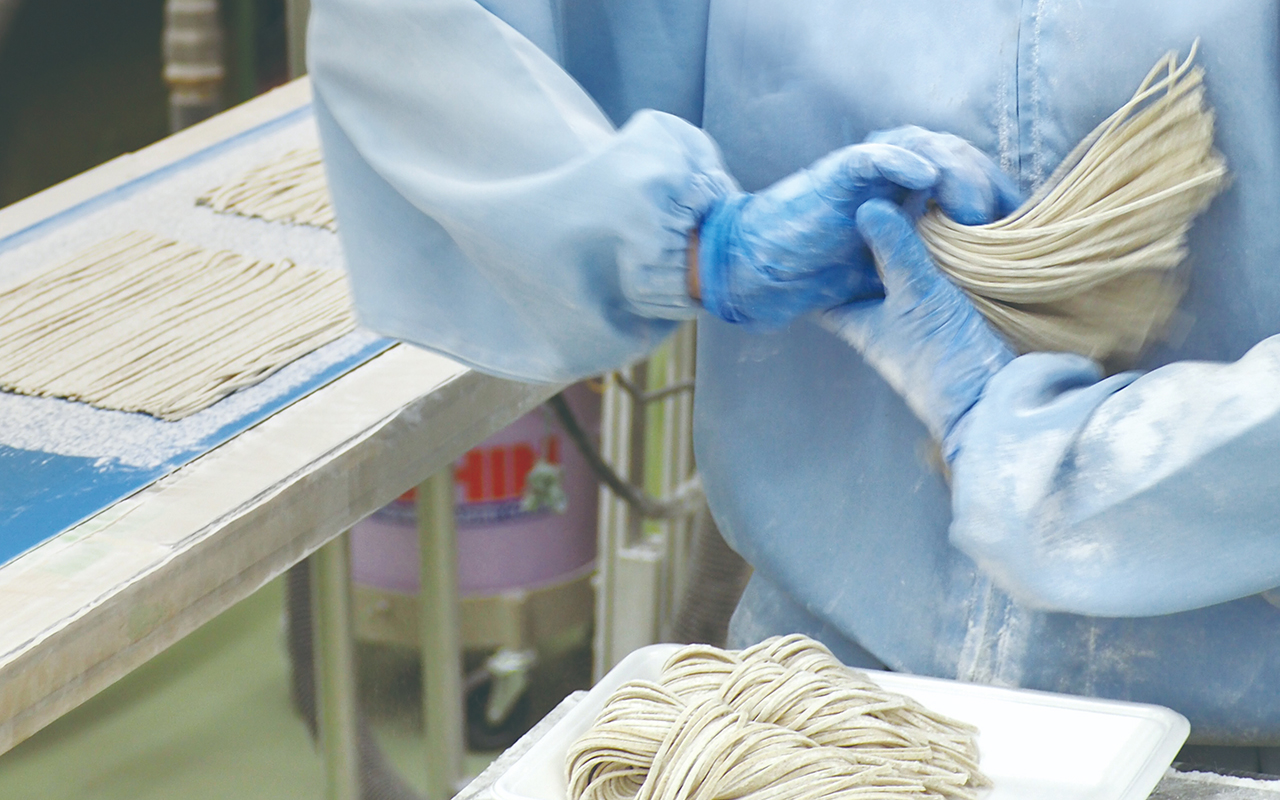 そばの風味を活かすため、作る直前に自社製粉し、挽き立てのそば粉を使用して製麺します。豊かな地下水を使い、つゆづくりも自社で手掛けます。製粉・製麺・つゆづくりまでの「一貫生産」で、1日に約3~5万食を生産、国内外に美味しい蕎麦とその魅力を届けています。