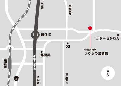 [電車の利用] JR鯖江駅より「つつじバス 河和田線」をご利用の上、 「うるしの里会館」で下車。