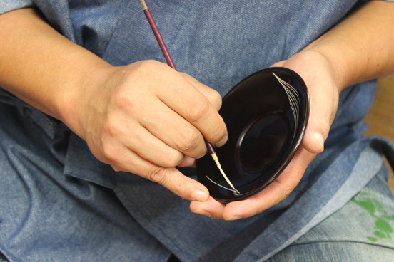 小皿やトレーなどに、漆で絵を描いて金粉・銀粉・色粉を蒔いてもらいます。
